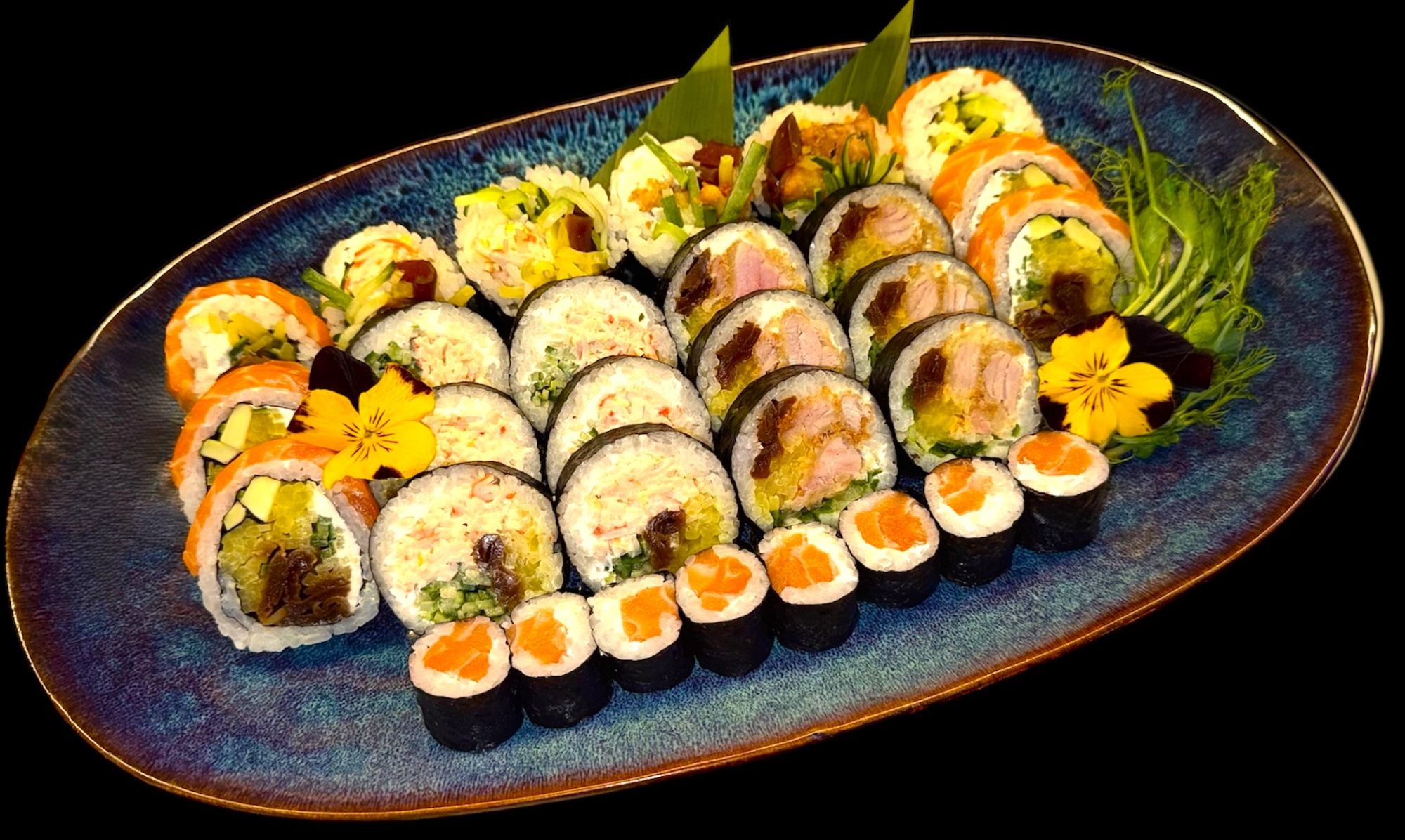 6 FUTO SAŁATKA SURIMI, 6 FUTO PIECZONY ŁOSOŚ, 6 CALIFORNIA KREWETKA W TEMPURZE OBKŁADANA ŁOSOSIEM, 6 CALIFORNIA TUŃCZYK W TEMPURZE OBKŁADANY MANGO, 6 CALIFORNIA Z MAŚLANĄ OBKŁADANA AWOKADO, 8 HOSO Z OGÓRKIEM, 8 HOSO Z MANGO, 2 NIGIRI Z WĘGORZEM, 2 NIGIRI Z TAMAGO, 2 NIGIRI Z KREWETKĄ